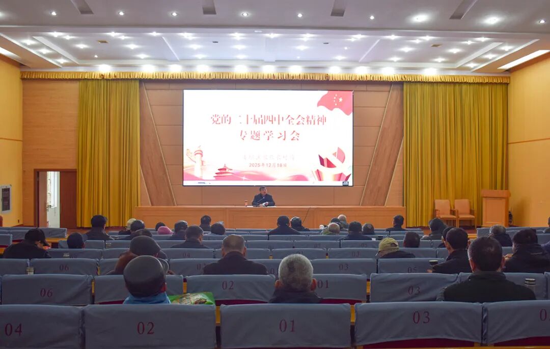 多功能厅内,第六支部书记钱存来领学“党的二十届四中全会精神宣讲提纲”原文,该局4个老干部党支部100多名老党员聚精会神地聆听宣讲。
