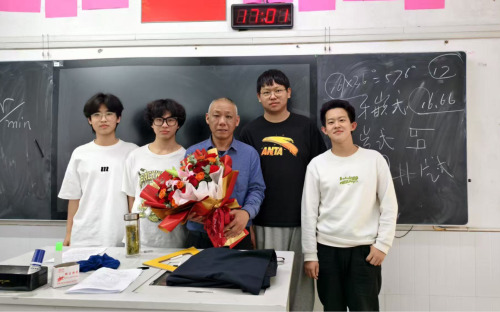 “下午两节课连着上,我特意放慢节奏,想把知识点再嚼碎些。”满头白发的陆建根说,当天下午5时10分,他像往常一样叮嘱学生“认真复习、沉着应考”,预祝大家考个好成绩,转身收拾教具时,班长邓超突然捧着鲜花走来:“陆老师,等一下!”说着便转身去了班主任陈玉奇的办公室,捧来一束鲜花,献给陆建根。陆建根莫名其妙,陈玉奇走上讲台,揭开谜底:“陆老师陪伴了你们三年,今天,是陆老师上的最后一课,班长代表大家送的这束鲜花,就是我们为他举办的荣退仪式!”一时间,全班39名学生集体起立鼓掌,喊出“陆老师,我们爱你”的心声。随后,学生们分批上台与陆建根合影:有人模仿“祖孙并肩”的亲昵姿态,有人行“敬礼礼”致敬师恩,女生们则轻轻拥抱这位“像父亲一样的老师”。